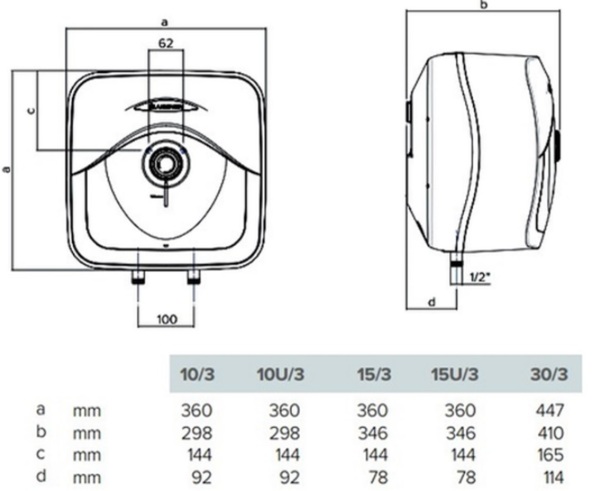 Ariston Andris RS 30/3 - это компактный электрический накопительный водонагреватель, предназначенный для обеспечения горячей водой в небольших объемах, например, на кухне или в маленьком офисе. Стильный квадратный корпус придает устройству элегантный вид.