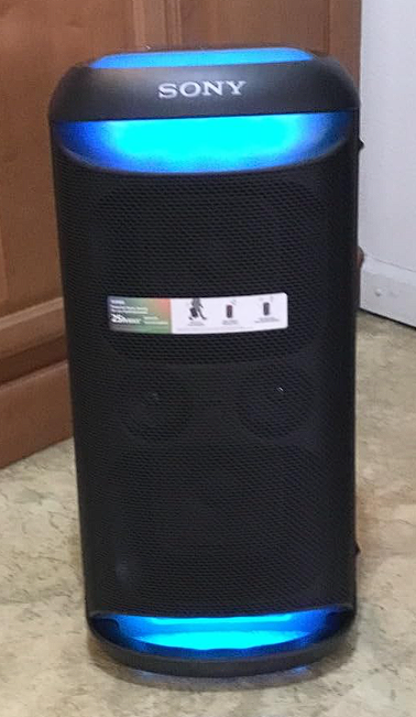 Колонка большая, светомузыка прям добавляет атмосферы, огоньки в ритм танцуют. Звук крутой, бас ощущается, весь пол трясется, чистый, без треска и хрипа. Громкости хватает что бы во всем доме было слышно. Батарея живет 8-10 часов, можно целый день слушать и не заряжать. Колесики помогают катать, она не самая легкая, зато не упадет.