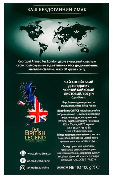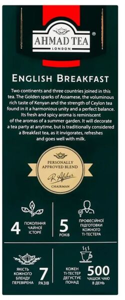 Чай Ahmad tea Английский к завтраку - смесь верхних чайных листьев из Цейлона, Ассама и Кении, характерная для традиционной английской чашки крепкого черного чая. Прекрасно ободряет и освежает в любое время дня. Обычно подается утром с молоком или без него. Ahmad Tea - один из мировых лидеров чайного рынка. Это семейное предприятие, основанное на опыте четырех поколений в создании уникальных чаев эксклюзивного качества. На протяжении многих лет, с ростом репутации и распространением чая Ahmad Tea, стало очевидно, что люди во всем мире разделяют страсть к чаю, который стал чем-то большим, чем просто освежающим напитком. Он стал приятной, незабываемой церемонией, которая доставляет удовольствие.