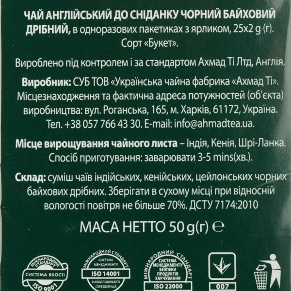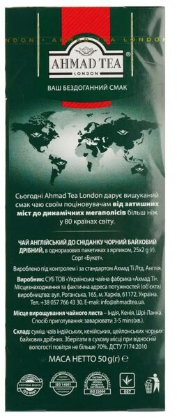 Чай Ahmad tea Английский к завтраку - смесь верхних чайных листьев из Цейлона, Ассама и Кении, характерная для традиционной английской чашки крепкого черного чая. Прекрасно ободряет и освежает в любое время дня. Обычно подается утром с молоком или без него. Ahmad Tea - один из мировых лидеров чайного рынка. Это семейное предприятие, основанное на опыте четырех поколений в создании уникальных чаев эксклюзивного качества. На протяжении многих лет, с ростом репутации и распространением чая Ahmad Tea, стало очевидно, что люди во всем мире разделяют страсть к чаю, который стал чем-то большим, чем просто освежающим напитком. Он стал приятной, незабываемой церемонией, которая доставляет удовольствие.