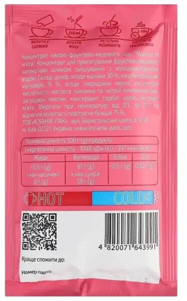 Чай Ascania Малина и мята 50 г - это фруктово-медовый чай с природными компонентами для бодрости и поддержания иммунитета. Напиток на основе цветочного меда, малины, черной смородины и мяты освежает летом, тонизирует зимой и имеет приятный ягодный вкус с мятными нотками. Его можно употреблять как горячим, так и холодным, что делает его универсальным для любого времени года.