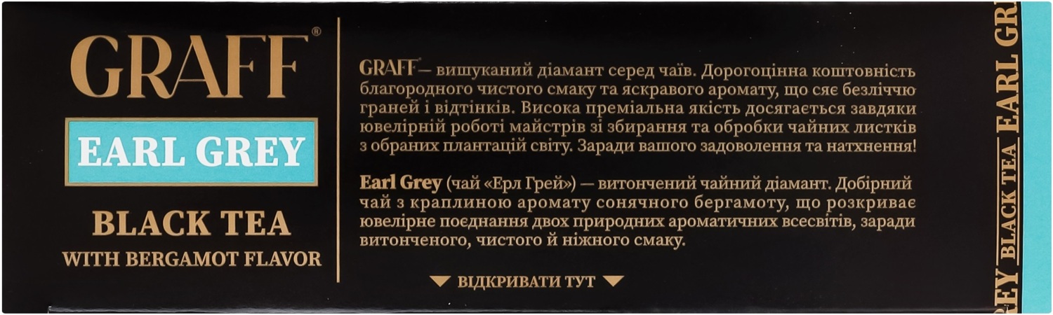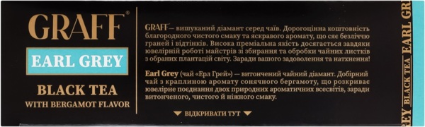 Graff - изысканный бриллиант среди чаев. Драгоценность благородного чистого вкуса и яркого аромата, сияющая множеством граней и оттенков. Высокое премиальное качество достигается благодаря ювелирной работе мастеров по сбору и обработке чайных листьев с избранных плантаций мира. Ради вашего удовольствия и вдохновения! Earl Grey (чай "Эрл Грей") — изящный чайный бриллиант. Отборный чай с капелькой аромата солнечного бергамота, раскрывающий ювелирное сочетание двух природных ароматических вселенных ради изящного, чистого и нежного вкуса.