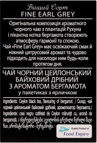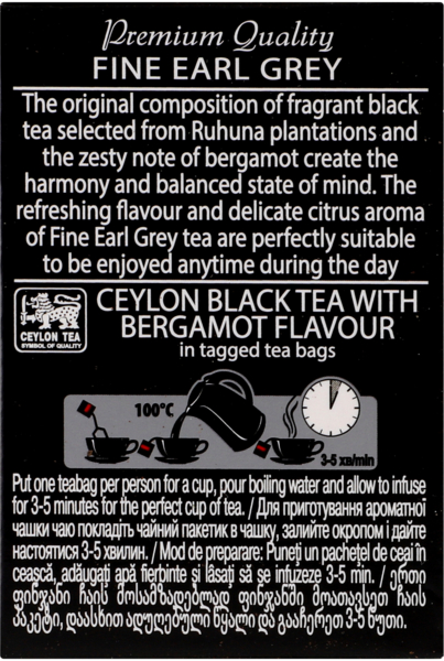Оригинальная композиция ароматного черного чая с плантаций Рухуна и пикантная нотка бергамота создают атмосферу гармонии и спокойствия. Чай "Fine Earl Grey" обладает освежающим вкусом и нежным цитрусовым ароматом и прекрасно подходит для наслаждения им в любое время дня.