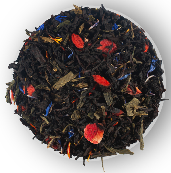 Champagne Splashes — бленд черного цейлонского листового чая и зеленого китайского листового чая с кусочками сушеной клубники, лепестками василька и ароматом земляники в прозрачных пирамидках.