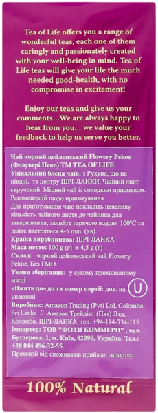Чай Tea of Life "Flowery Pekoe" — это черный байховый чай в рассыпном формате. Этот чай является хорошим выбором для тех, кто ищет более нежный и ароматный черный чай без ароматизаторов, но с естественными цветочными нотками, характерными для высококачественных чайных листьев.