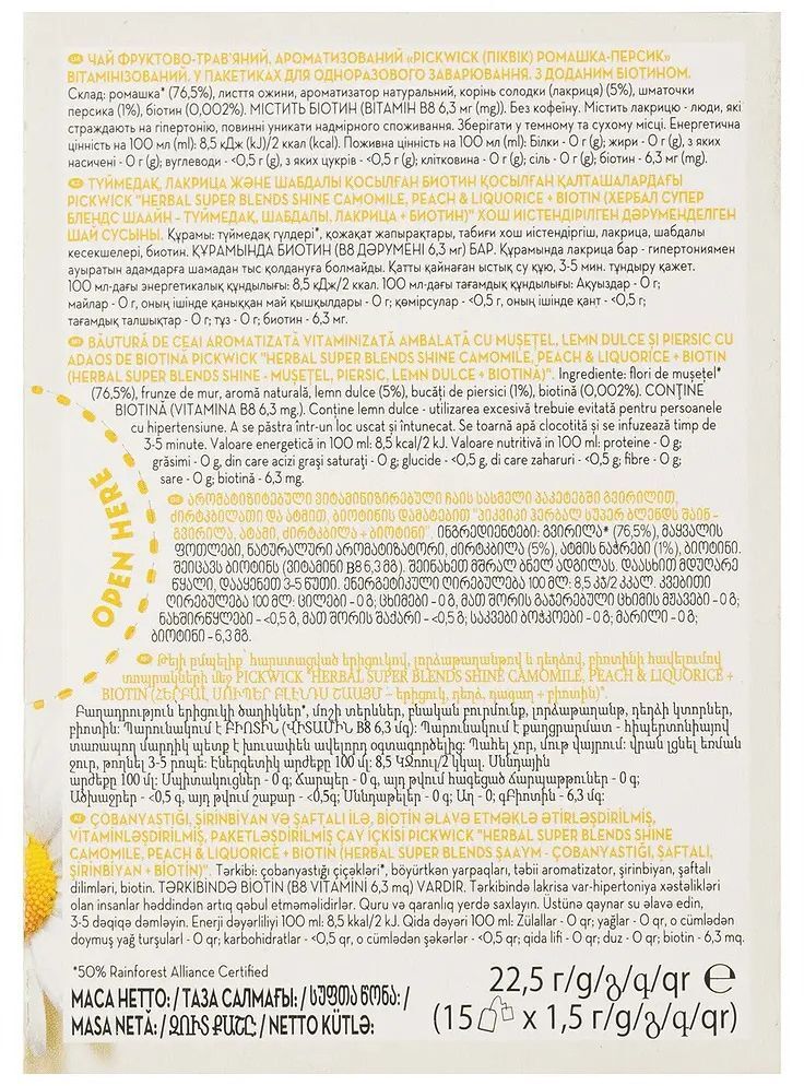 Яркий ассортимент чаев и травяных настоев от всемирно известного бренда Pickwick создан специально для того, чтобы вы могли в полной мере насладиться каждым моментом или поговорить откровенно с близким человеком. Обычно травяной чай — это легкий напиток с приятным ароматом, который является полной противоположностью кофе. Чай Pickwick подарит вам много позитива и заряда энергии. Состоит из натуральных цветов ромашки, кусочков персика и обогащен витаминами (биотином). Чай обогащен витаминами, чтобы поддержать ваш иммунитет. Травяной чай - это не просто вкусный напиток, но и невероятно полезный для вашего здоровья.