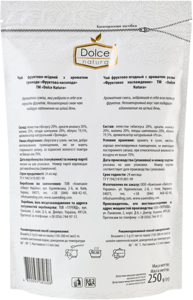 Dolce Natura "Фруктовое наслаждение" — насыщенная фруктовая смесь состоит из лепестков гибискуса, цукатов ананаса, малины, плодов шиповника и яблок, дополнена нежным натуральным ароматом розы. При заваривании напиток приобретает глубокий рубиновый цвет, имеет приятный сладкий вкус с легкой кислинкой и дарит яркий летний аромат.