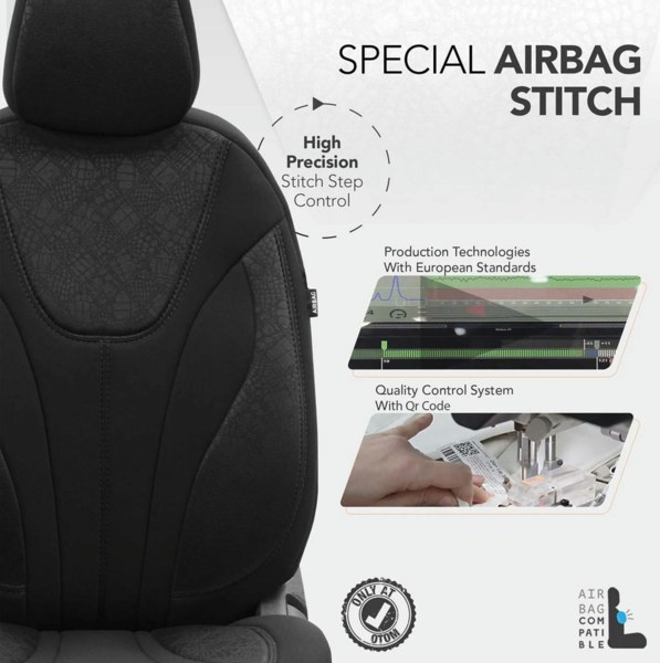 - Стандартные чехлы оснащены сертифицированным швом Airbag, что обеспечивает их совместимость с автомобилями, оснащенными боковыми подушками безопасности. Специальная конструкция шва позволяет полностью закрыть сиденье, не нарушая работу Airbag.