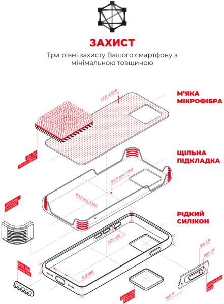 При изготовлении чехла использовались премиальные материалы - Liquid silicone, с Soft Touch покрытием. Мягкая подкладка из премиальной микрофибры надежно защитит ваш гаджет от царапин, грязи и пыли. Чехол имеет ребра жесткости, таким образом телефон защищен со всех сторон. Дополнительным преимуществом является наличие бортов, выступающих над дисплеем, и наличие дополнительной пластиковой рамки над задней камерой для дополнительной защиты. В чехле предусмотрены все необходимые вырезы и кнопки. Также аксессуар не мешает использованию портов и интерфейсов устройства.