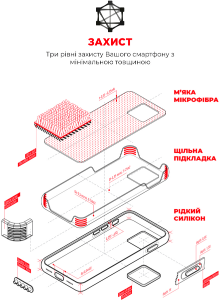 При изготовлении чехла использовались премиальные материалы - Liquid silicone, с Soft Touch покрытием. Мягкая подкладка из премиальной микрофибры надежно защитит ваш гаджет от царапин, грязи и пыли. Чехол имеет ребра жесткости, таким образом телефон защищен со всех сторон. Дополнительным преимуществом является наличие бортов, выступающих над дисплеем, и наличие дополнительной пластиковой рамки над задней камерой для дополнительной защиты. В чехле предусмотрены все необходимые вырезы и кнопки. Также аксессуар не мешает использованию портов и интерфейсов устройства.