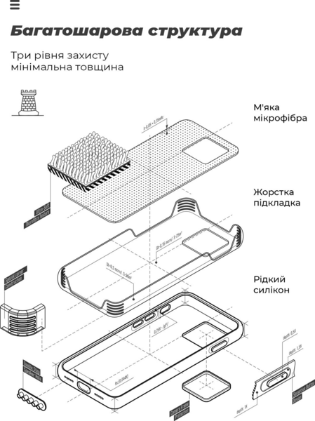 Накладка легко надевается на смартфон благодаря растягивающимся бортикам, которые также дополнительно защищают, выступая над поверхностью дисплея и камеры. В чехле предусмотрены все необходимые вырезы и кнопки. Он совместим со всеми типами защитных стекол.