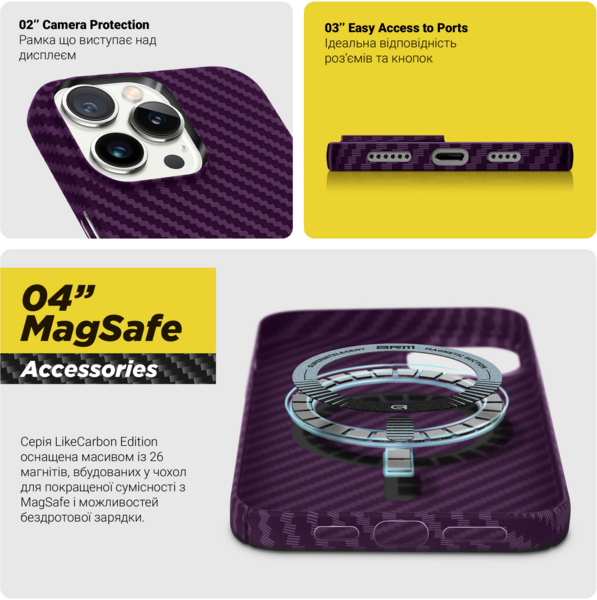 Серия LikeCarbon MagCase оснащена массивом из 26 магнитов, встроенных в чехол для совместимости с MagSafe и возможности использования беспроводной зарядки.