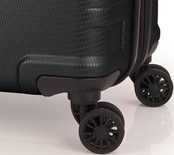 Внутреннее пространство разделено на два отделения перегородкой, которая имеет сетчатый карман на молнии. Ремни для фиксации помогут упорядочить и закрепить ваши вещи. Также, благодаря функции расширения, возможно увеличить объем чемодана до 78 литров. Чемодан оснащен четырьмя сдвоенными колесами с возможностью разворота на 360°. Конструкция обеспечивает равномерное перераспределение нагрузки на каждое колесо, что способствует плавному движению и маневренности чемодана. Колеса изготовлены из термопластичного полиуретана (TPU). Этот материал обладает прочностью сравнимой с пластиком, гибкостью силикона, а также повышенной устойчивостью к перепадам температуры и истиранию. Благодаря этому колеса имеют длительный срок эксплуатации. Отличительной особенностью колес из TPU-материала является снижение шума до минимума при движении чемодана по неровной поверхности.