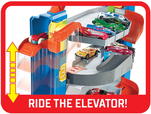 Этот четырехэтажный гараж Hot Wheels прекрасно подойдет для хранения более 20 машинок! Поднимай или спускай машинки на любой из 4 уровней, чтобы припарковать их. Устраивай безумные заезды - запускай машины вниз по спиральному спуску, чтобы быстро добраться до нижнего этажа, где можно заправить или проверить машинки перед следующими гонками.