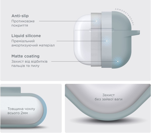 ArmorStandart Hang Case - это силиконовый чехол, который сочетает в себе защиту, комфорт и продуманную простоту в использовании. Он разработан для тех, кто ценит функциональность в деталях и хочет сохранить беспроводной чехол для наушников в безопасности при ежедневном использовании.