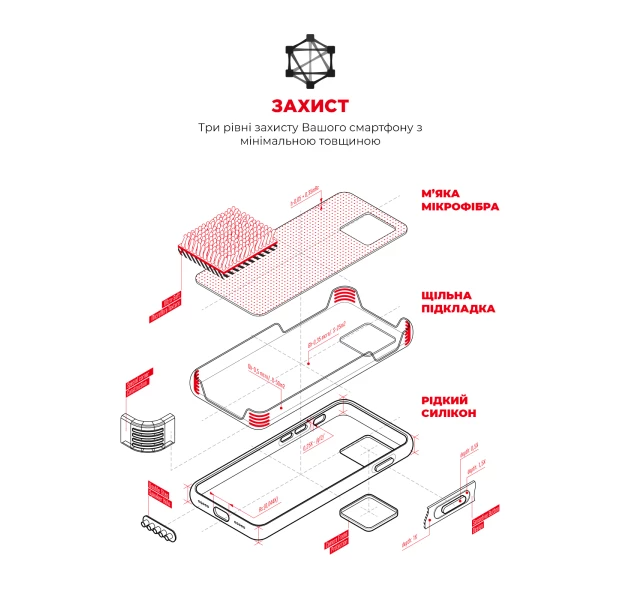 При изготовлении чехла использовались премиальные материалы – Liquid silicone, с Soft Touch покрытием. Мягкая подкладка из премиальной микрофибры надежно защитит ваш гаджет от царапин, грязи и пыли. Чехол имеет ребра жесткости, таким образом телефон защищен со всех сторон. Дополнительным преимуществом является наличие выступающих бортов над дисплеем и наличие дополнительной пластиковой рамки над задней камерой для дополнительной защиты. В панели предусмотрены все необходимые вырезы и кнопки. Также аксессуар не мешает использованию портов и интерфейсов устройства.