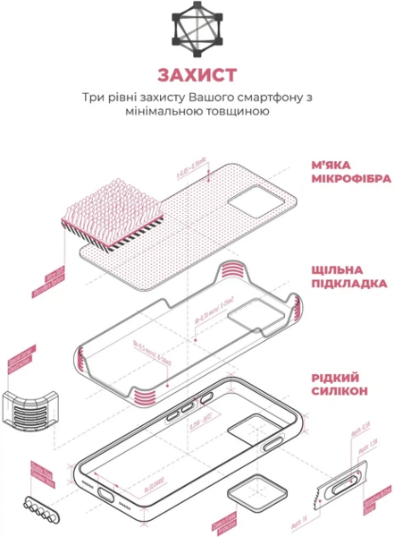 При изготовлении чехла использовались премиальные материалы – Liquid silicone, с Soft Touch покрытием. Мягкая подкладка из премиальной микрофибры надежно защитит ваш гаджет от царапин, грязи и пыли. Чехол имеет ребра жесткости, таким образом телефон защищен со всех сторон. Дополнительным преимуществом является наличие выступающих бортов над дисплеем и наличие дополнительной пластиковой рамки над задней камерой для дополнительной защиты. В панели предусмотрены все необходимые вырезы и кнопки. Также аксессуар не мешает использованию портов и интерфейсов устройства.