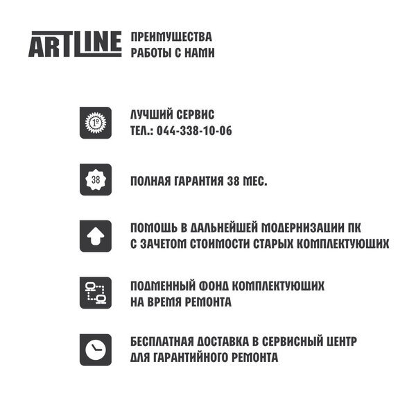 Все персональные компьютеры ARTLINE проходят поэтапную сборку и проверку нашими профессионалами. Аккуратный монтаж и длительный этап предпродажного тестирования сводит на нет возможные технические нюансы, влияющие на бесперебойную работу компьютера при его эксплуатации после покупки.