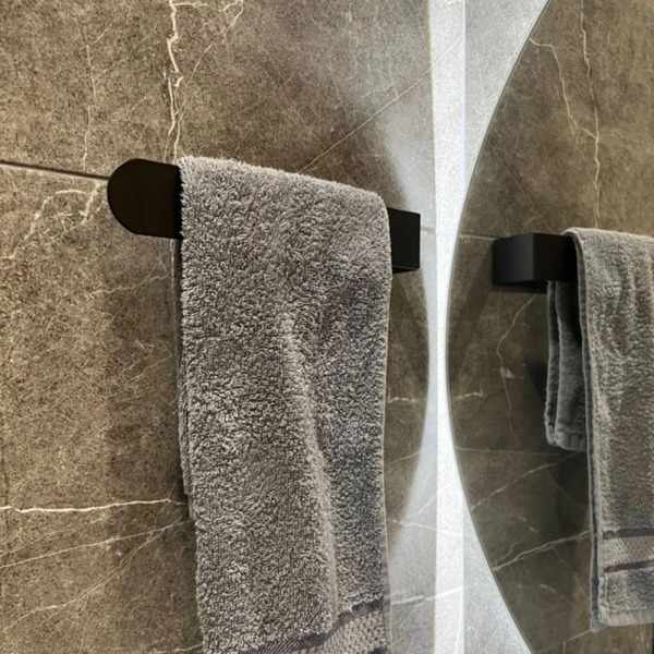 Модель монтируется на стену с помощью скрытого крепления, что обеспечивает чистый внешний вид без видимых шурупов. Удобная длина в 230 мм позволяет легко размещать и снимать полотенца, не занимая много места.