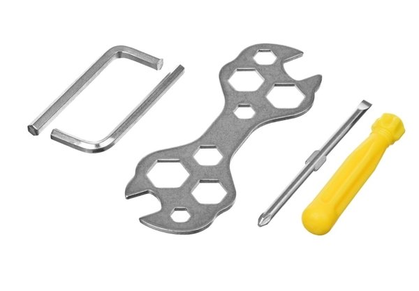 Комплектация: велосипед, 2 боковых колеса, колокольчик, часы, защита на заднее колесо, светоотражатель, набор инструментов, дополнительная защита.