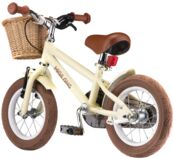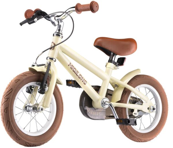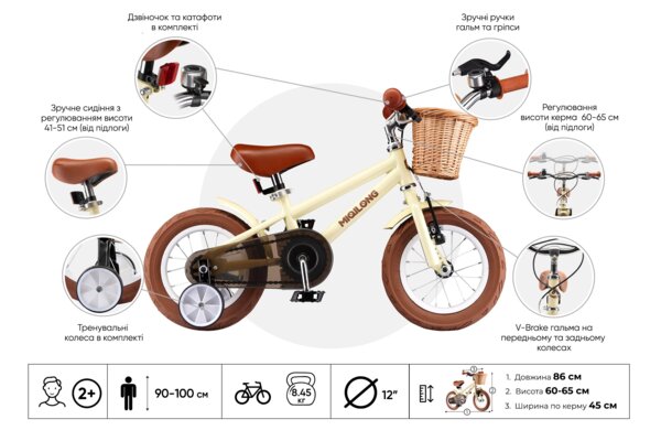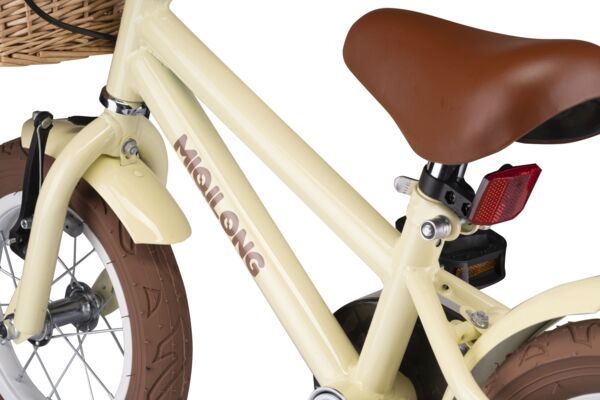 Детский велосипед Miqilong RM это воплощение современного видения ретро дизайна. Стилизация под 50-тые года ХХ века и корзинка ручного плетения из натурального ротанга делают дизайн велосипеда изящным и утонченным. Рама велосипеда выполнена из металла и обладает необходимым запасом прочности, чтобы выдержать все тяготы обучения ребенка катанию на велосипеде. Рама выполнена по классической высокой схеме городского велосипеда с высоким рулем. Подобная конструкция обеспечивает удобную посадку и позволяет ребенку ездить на велосипеде с ровной осанкой, не горбясь. Руль и сидение регулируются по высоте в широком диапазоне. Сидение мягкое, с покрытием из ECO-кожи. Грипсы руля мягкие резиновые, с боковой защитой рук при падении. Ручной тормоз V-Brake на переднем и ножной тормоз на заднем. Подобная комбинированная схема , где для торможения задним колесом нужно нажимать на педали в обратном направлении, позволит маленькому ребенку легче освоиться. Так как самым маленьким детям бывает сложно пользоваться ручным тормозом. Диск колеса 12` традиционный, спицевый с классической втулкой на подшипниках. Высокий и широкий профиль покрышки обеспечат комфортное катание как по асфальту, так и по неровностями. Колеса дополнительно защищены брызговиками выкрашенными в цвет велосипеда и надежно защитят от грязи и брызг. В комплектацию велосипеда входит 2 катафота, звоночек на руль, набор инструментов для сборки и обслуживания велосипеда, корзинка из натурального ротанга, набор боковых обучающих колес В комплекте: Корзинка из натурального ротанга, 2 катафота, боковые тренировочные колеса, звоночек на руль, набор для обслуживания и сборки велосипеда. Велосипед поставляется на 85% собранным. Во время сборки потребуется установить руль, педали, настроить тормоза и установить аксессуары. Необходимые для сборки инструменты поставляются в комплекте.