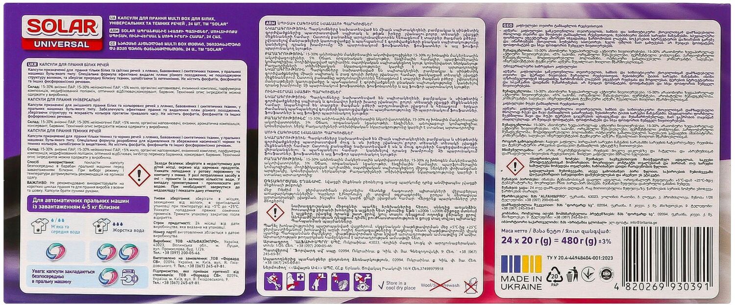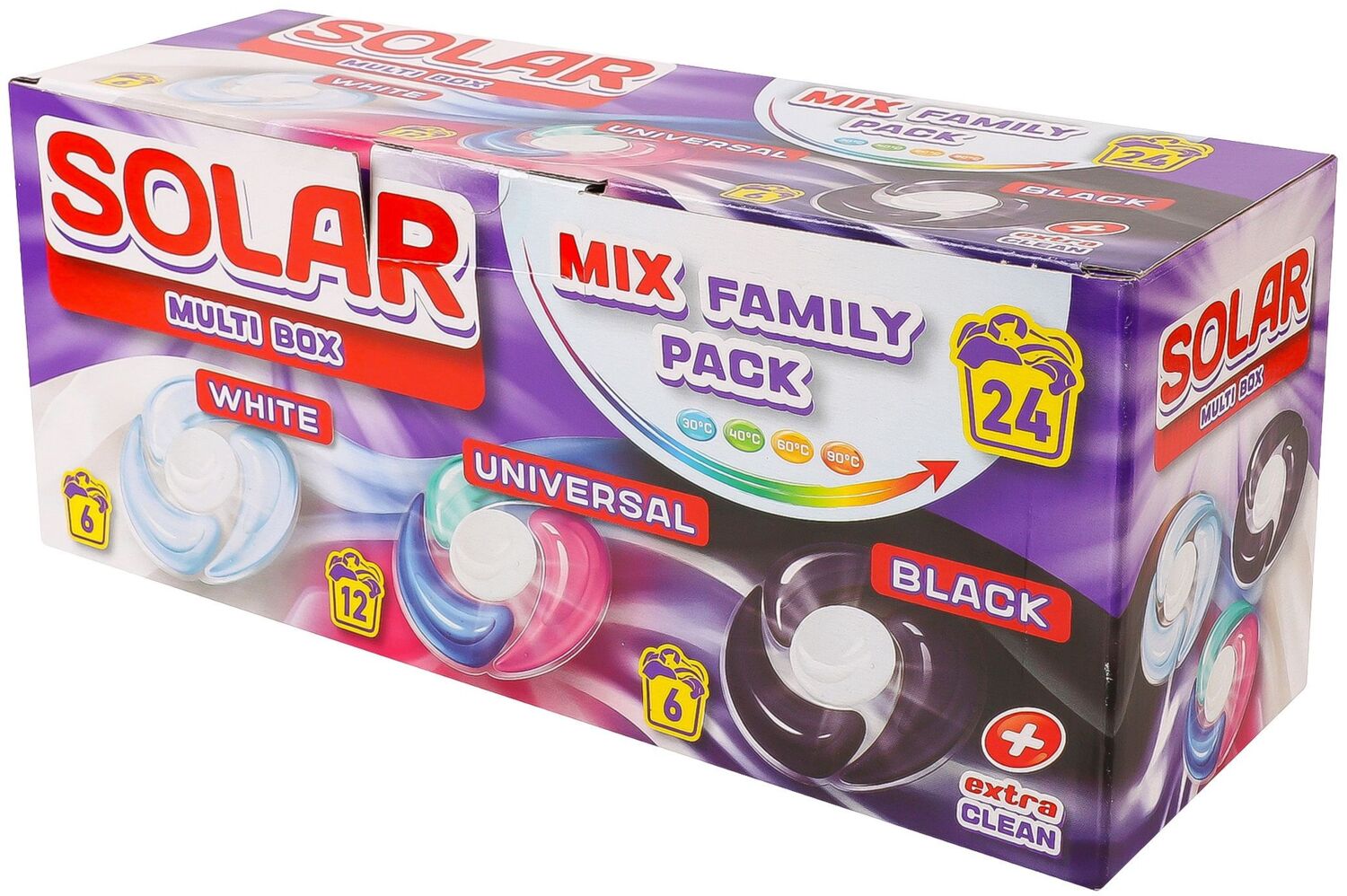 Больше не нужно держать в ванной комнате большое количество средств, с помощью Multi Box от торговой марки Solar можно стирать белые вещи, темные вещи и микс вещей отдельно друг от друга. Капсулы предназначены для эффективной стирки белых, темных и универсальных вещей. При этом можно быть уверенными, что белые вещи станут действительно белыми, ведь в капсуле для белых вещей содержится комплекс мощных отбеливателей, которые убирают желтизну, стирают и делают вещи белоснежно белыми. Капсула для черных вещей содержит комплекс энзимов, которые деликатно воздействуют на ткань, а также комплекс веществ для восстановления и насыщения темных цветов. Универсальная капсула подходит для стирки всех остальных вещей, содержит мощный комплекс пятновыводителей, которые отстирывают даже сложные загрязнения. В наборе 24 капсулы трех типов.
