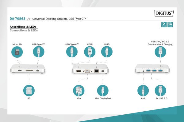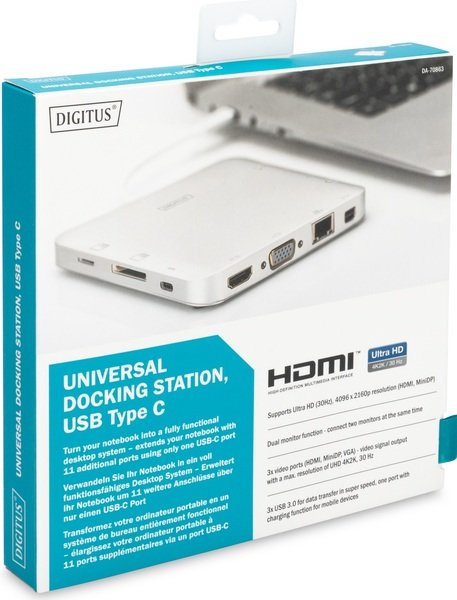 Полнофункциональная универсальная док-станция USB Type-C от Digitus предлагает все необходимое для создания полностью оборудованного рабочего места. Он предлагает три видеоинтерфейса (HDMI, MiniDP и VGA), где два монитора могут работать одновременно.