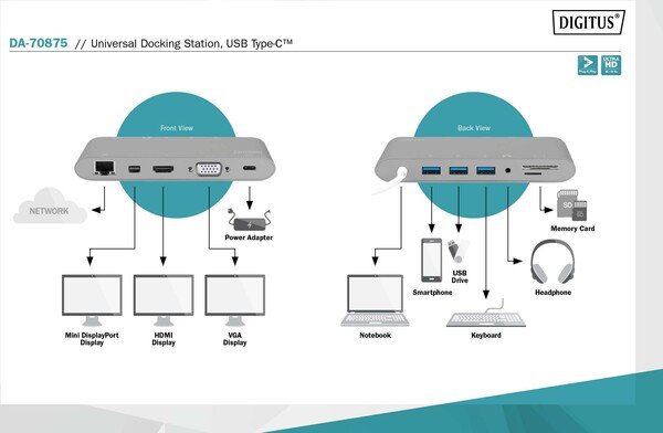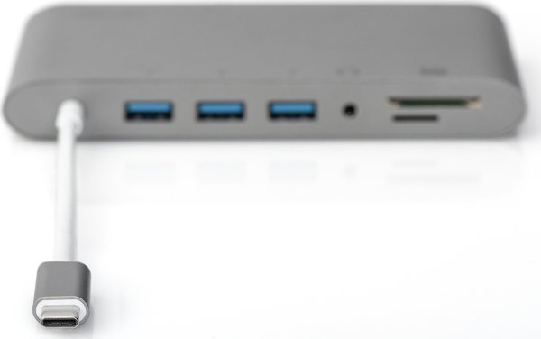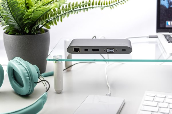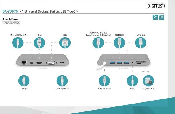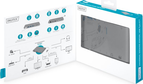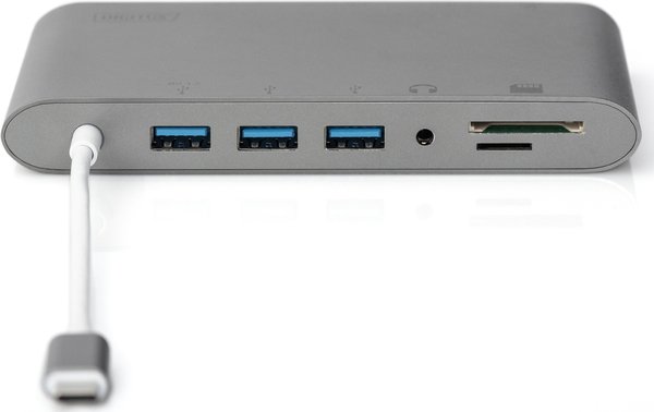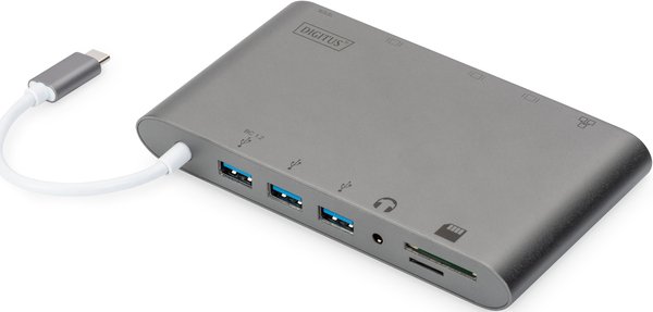 Полнофункциональная универсальная док-станция, USB Type-C от DIGITUS предлагает все для создания полностью оборудованного рабочего места. Она предлагает три видеоинтерфейса (HDMI, Mini DP, VGA), через которые можно одновременно работать с двумя мониторами. Таким образом, достигается наилучшее поддерживаемое разрешение: Brilliant UHD (4K2K / 30 Гц). Кроме того, монитор оснащен тремя портами USB 3.0, причем один из них (5 В / 1,5 А) обеспечивает также функцию зарядки мобильных устройств. Интерфейсы USB дополнены портом USB-C с функцией доставки питания (PD 2.0). Также встроены два устройства чтения карт памяти (MicroSD, SDHC, SDXC/MMC). Кроме того, ноутбук можно подключить к сети по кабелю через порт Gigabit Ethernet. В довершение всего имеется стереофонический аудиопорт. Многофункциональная универсальная док-станция DIGITUS USB Type-C позволяет подключить к ноутбуку 11 дополнительных портов, используя всего один порт USB-C.