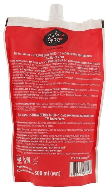 Специалисты украинского бренда Dolce Vero не устают создавать новые косметические продукты для очищения кожи и ухода за ней. Изюминка каждого средства, вышедшего из-под их пера, – прекрасный, соблазнительный аромат десерта. Больше всего вам нравится лакомиться клубничной вкуснотой? Значит именно для вас было создано восхитительное жидкое крем-мыло с молочными протеинами Strawberry Milk. Оно бережно очищает кожный покров, увлажняет и тонизирует его, освежает и смягчает.