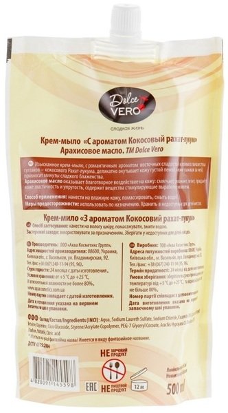 - Жидкое мыло Dolce Vero Кокосовый рахат-лукум дой-пак 500 мл