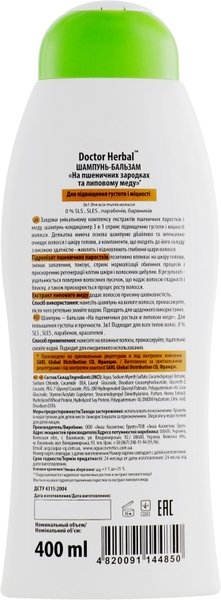 - Шампунь-бальзам Dr Herbal «На пшеничных зародышах и липовом меде» 400мл