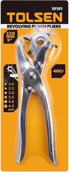 Дырокол от Tolsen — это удобный и надежный ручной инструмент, предназначенный для создания точных отверстий в коже, ткани, резине, пластике, картоне и подобных материалах. Идеально подходит для мастерских, бытового использования, работы с ремнями, сумками, обувью и другими изделиями. Инструмент оснащен шестипозиционным барабаном, что позволяет быстро менять размер отверстия без необходимости в дополнительных насадках. Это обеспечивает универсальность и удобство в работе. Пробойники изготовлены из высококачественной стали, прошли закалку и фосфатирование, что обеспечивает высокую твердость, износостойкость и длительный срок эксплуатации даже при интенсивном использовании. Основная конструкция инструмента — металлическая, хромированная, что придает дыроколу не только прочности, но и эстетического вида и защиты от коррозии.
