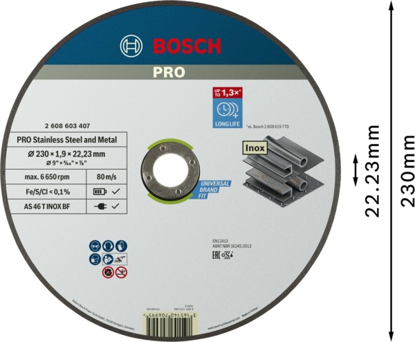- Диск отрезной Bosch Professional для нержавеющей стали и металла 230x1.9x22.23мм (2.608.603.407)