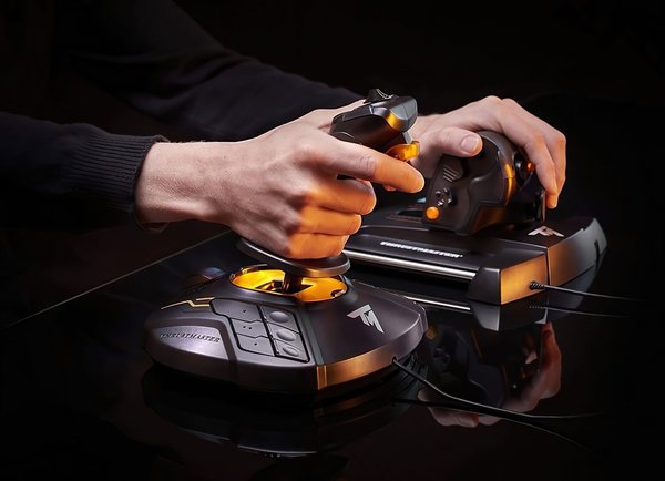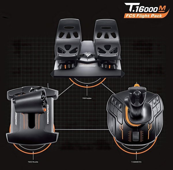 Джойстик T.16000M FCS предлагает 4 независимых оси, включая поворотный переключатель руля направления (управляется поворотом джойстика), 16 функциональных кнопок с сенсорной идентификацией, 8-позиционный переключатель точки обзора и эргономичный триггер. Благодаря оранжевым акцентам и подсветке обеспечивается принципиально новый уровень погружения.