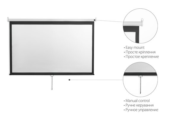 Экран со стандартным соотношением сторон, под проектор замечательно подходит. Сворачивается внутрь корпуса, там находится в сохранности полотно. Во время показа нет бликов, картинка равномерно распределяется, не теряя четкости и яркости. Все цвета отображаются различимо, для моей аудитории 108 дюймов в самый раз. Пружинный механизм быстро его сматывает, никаких ручных действий не нужно. Подвесное полотно 2E прочное, не теряет белизны.