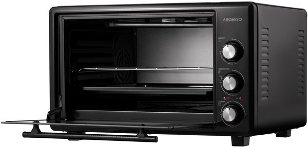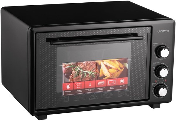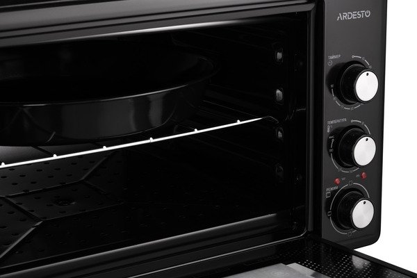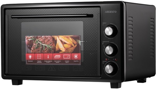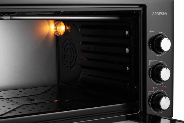 Дверца печи изготовлена из закаленного стекла, а справа от них на передней панели встроены три колесика для настройки устройства. Внутренняя камера объемом 40 л имеет эмалированное покрытие и освещение. Одной из особенностей модели является скрытый нижний нагревательный элемент и это не влияет на мощность устройства, составляющую 1 300 Вт. В целом печь ARDESTO достаточно компактная (345×518×400 мм), поэтому для нее обязательно найдется место даже на маленькой кухне.