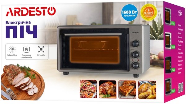 Производя товары, ARDESTO стремится сделать их использование максимально простым и интуитивно понятным. Исключением не является и эта модель: выберите один из трех режимов работы, установите необходимую температуру в диапазоне от 50 до 300 °C, а готовность блюда напомнит встроенный таймер с запасом времени до 90 минут. Для дополнительного удобства предусмотрена индикация окончания процесса приготовления. Кроме того, в комплекте с моделью производитель поставляет для нужд пользователей два противня (круглый и прямоугольный) и решетку для гриля.