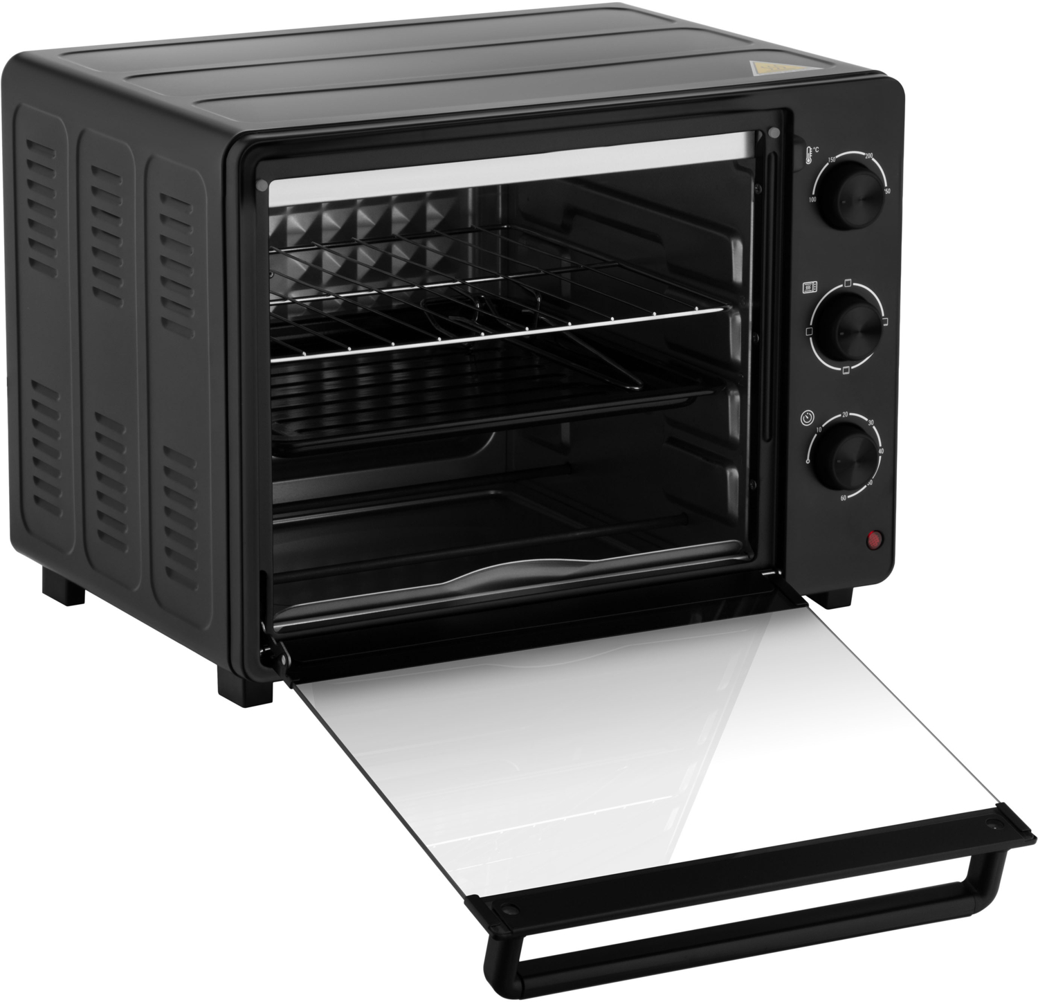 Внутри предусмотрено внутреннее освещение, поэтому можно наблюдать за процессом приготовления, не открывая дверцу. Стекло дверцы закалено, выдерживает воздействие высокой температуры и сохраняет тепло внутри камеры. Нагревательные элементы из нержавеющей стали обеспечивают равномерное распределение тепла и длительный срок службы.