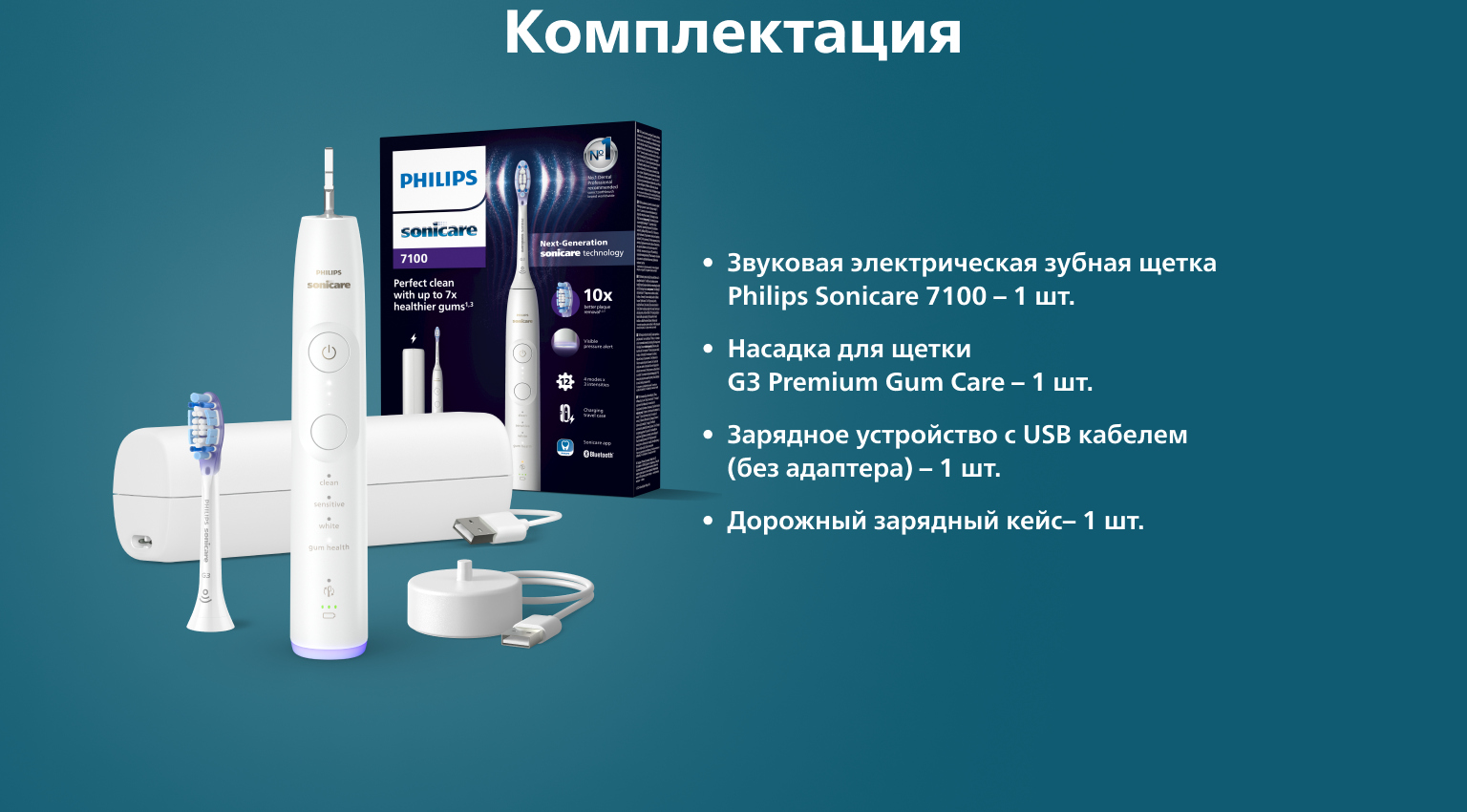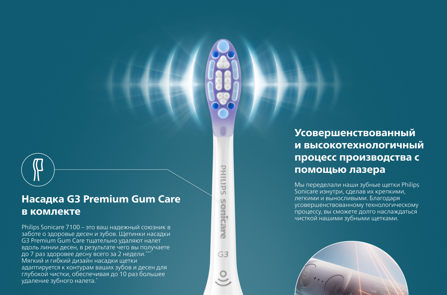 Начинайте каждый день стильно с передовой технологией Sonicare. Щетка 7100 с насадкой G3 Premium Gum Care обеспечивает до 7 раз более здоровые десны и до 10 раз лучшее удаление налета всего за 2 недели. Интеллектуальная система магнитной чистки бережно очищает вдоль линии десен и между зубами, автоматически адаптируя мощность. Световое кольцо предупреждает о чрезмерном давлении, а SmarTimer поможет придерживаться рекомендованных 2 минут чистки.