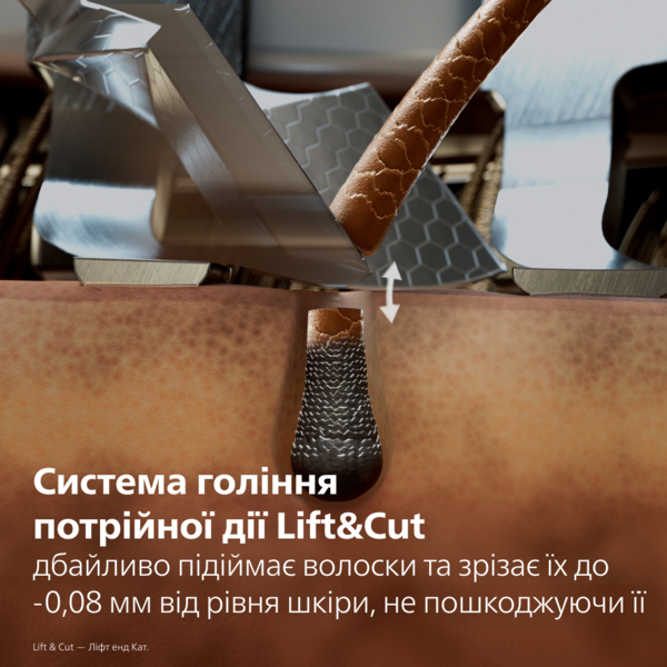 Запатентованная система бритья тройного действия Lift&Cut бережно поднимает волоски от самого корня, обеспечивая точное срезание, не повреждая ее.