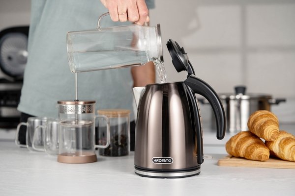 Во первых, электрочайник Ardesto EKL-F340BRZ красивый. Во вторых - "кипятильник" скрыт и сеточка снимается, можно чистить от накипи при необходимости отдельно от чайника. Оптимальный объем - всему отделу хватает чай попить. Ничем не воняет. Без воды не включается.