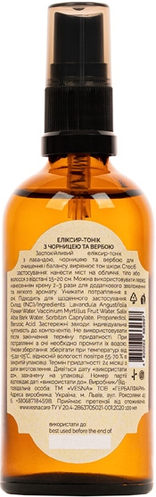 Эликсир-тоник с черникой и ивой – натуральный освежающий мост на основе гидролатов лаванды, черники и белой ивы – мягкий тоник для ежедневного очищения, тонизации и поддержания баланса кожи. Обладает противовоспалительным, антиоксидантным и легким противопигментным действием. Идеален для использования в качестве тоника после очищения или увлажняющего средства в течение дня.