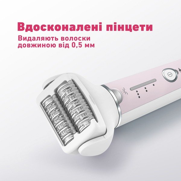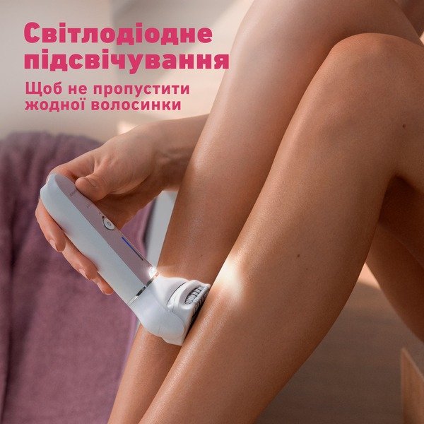 Эпилятор оснащен светодиодной подсветкой. Если вы нажимаете на кожу слишком сильно, светодиодный индикатор будет мигать, оповещая об этом и помогая выбрать подходящую силу давления для комфортной эпиляции и равномерного результата. Светодиодная подсветка также гарантирует, что вы не пропустите ни одной волосинки в труднодоступных местах.