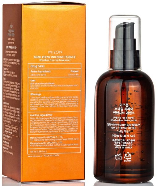 Mizon Snail Repair Intensive Essence - увлажняющая эссенция с улиточным муцином и аденозином восстанавливает и подтягивает кожу, выравнивает овал лица, сокращает морщины, стимулирует процессы регенерации, повышает гладкость, упругость и эластичность кожи. Эссенция также успокаивает раздражённую кожу, борется с акне, угревой сыпью.