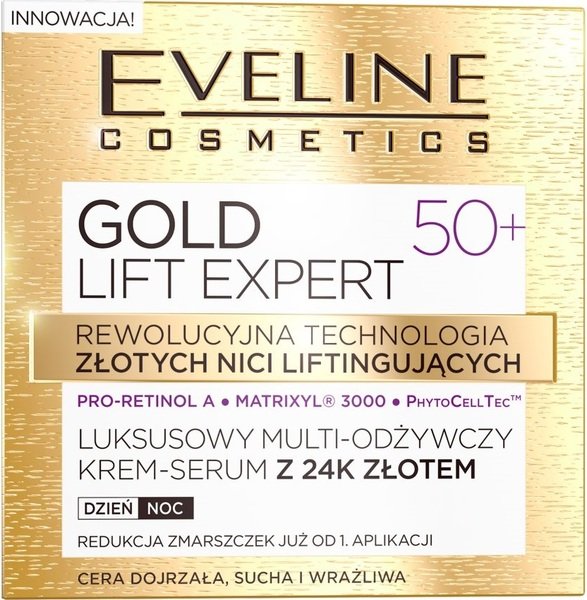 Крем-сыворотка Gold Lift ExpertМультипитательный с 24К золотом Eveline Cosmetics - это революционное омолаживающее решение для вашей кожи. Созданное на основе уникальной технологии золотых подтягивающих нитей, средство буквально преображает вашу кожу, дарит ей обновленный вид и вторую молодость.