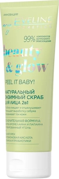 Eveline Cosmetics Beauty & Glow Peel It Baby! Natural Face Scrub – натуральный скраб для лица, созданный на основе ингредиентов растительного происхождения. Формула с папином, бромелаином, экстрактом клубники, пробиотиками, рисом, грецким орехом и другими компонентами мягко и тщательно удаляет глубокие и поверхностные загрязнения, отшелушивает и обновляет кожный покров. Благодаря действию скраба кожа приобретает гладкость, упругость и сияние.