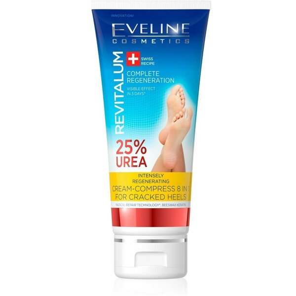 В составе Eveline Cosmetics Revitalum 25% Urea содержатся мочевина, пчелиный воск, кератин и восстанавливающий комплекс Radical Repair Technology. Благодаря такому составу средство питает, нормализует гидробаланс, предупреждает потерю влаги, активизирует процессы регенерации, разглаживает кожу и образует на ее поверхности невидимую липидную пленочку, оберегающую от огрубения.