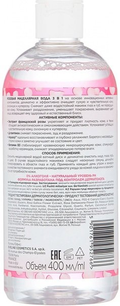 РОЗОВАЯ МИЦЕЛЛЯРНАЯ ВОДА 3В1 имеет физиологический pH, то есть подходящий и естественный для здоровой кожи. Обеспечивает 24-часовое увлажнение очень чувствительной и сухой коже, а также защищает ее от раздражений.Тщательно подобранные компоненты очищают кожу и успокаивают раздражение.