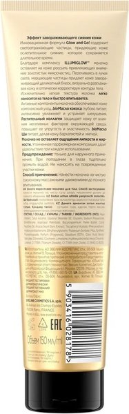 Благодаря комплексу ILLUMIGLOW молочко оставляет на коже россыпь едва заметных глазу золотистых микрочастиц, придающих образу деликатное мерцание. Светоотражающие частицы визуально разглаживают кожу и скрывают несовершенства. Активные компоненты: Масло кокоса глубоко питает, интенсивно увлажняет и устраняет шелушения. Растительный коллаген (Acacia Collagen) защищает кожу от влияния негативных факторов окружающей среды, повышает ее упругость и эластичность. Масло Ши питает, делая кожу бархатистой и мягкой.