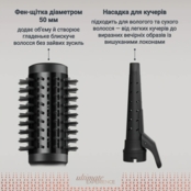 Фен-щетка 50 мм с керамическим покрытием обеспечивает равномерный нагрев, предохраняя волосы от пересушивания. Функция ионизации убирает статику, придавая волосам гладкость и естественный блеск.